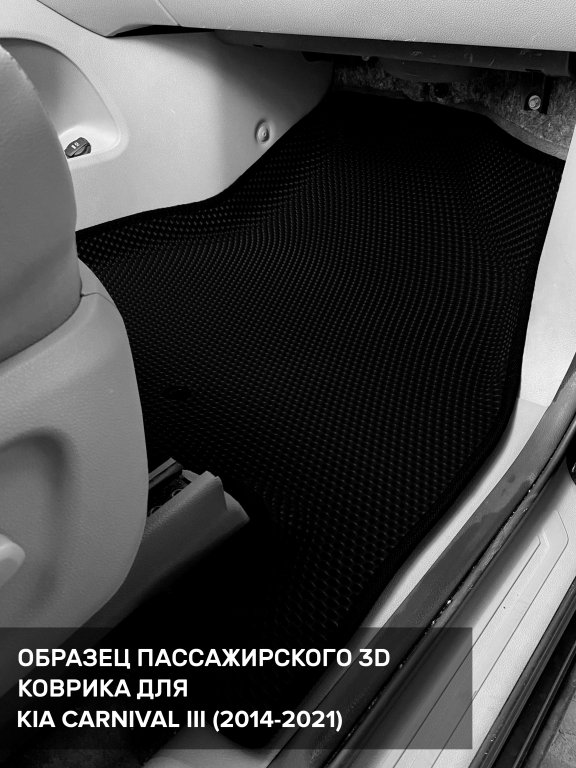 Автомобильные 3д коврики для Kia Carnival III передний ряд (2014-2021) в салон авто и багажник сделаны из инновационного полимерного материала EVA, изысканная структура в виде ячеек не дает воде, пыли и снегу разлетаться по салону машины и багажнику. 3д коврики зафиксированы на полу определенными клипсами, соответствующими Kia Carnival III передний ряд (2014-2021), и не двигаются в процессе езды.