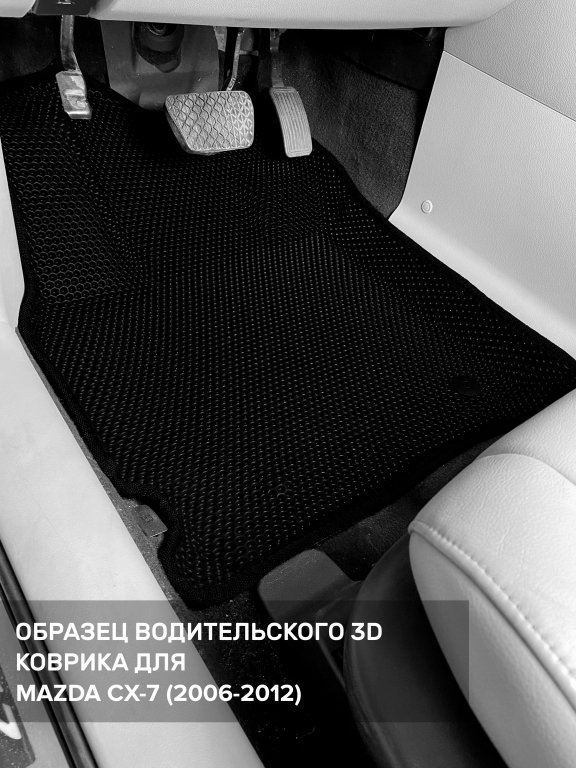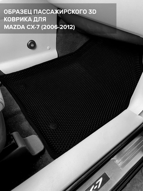 Автомобильные 3д коврики для Mazda CX-7 (2006-2012) в салон авто и багажник сделаны из инновационного полимерного материала EVA, изысканная структура в виде ячеек не дает воде, пыли и снегу разлетаться по салону машины и багажнику. 3д коврики зафиксированы на полу определенными клипсами, соответствующими Mazda CX-7 (2006-2012), и не двигаются в процессе езды.