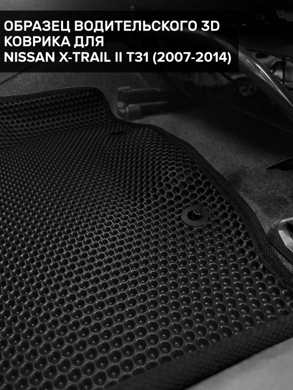 Автомобильные 3д коврики для Nissan X-Trail II T31 (2007-2015) в салон авто и багажник сделаны из инновационного полимерного материала EVA, изысканная структура в виде ячеек не дает воде, пыли и снегу разлетаться по салону машины и багажнику. 3д коврики зафиксированы на полу определенными клипсами, соответствующими Nissan X-Trail II T31 (2007-2015), и не двигаются в процессе езды.