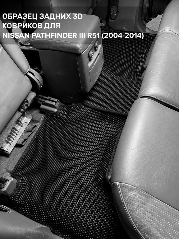 Автомобильные 3д коврики для Nissan Pathfinder III R51 7 мест (2004-2014) в салон авто и багажник сделаны из инновационного полимерного материала EVA, изысканная структура в виде ячеек не дает воде, пыли и снегу разлетаться по салону машины и багажнику. 3д коврики зафиксированы на полу определенными клипсами, соответствующими Nissan Pathfinder III R51 7 мест (2004-2014), и не двигаются в процессе езды.