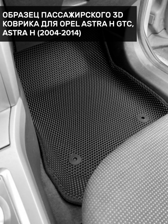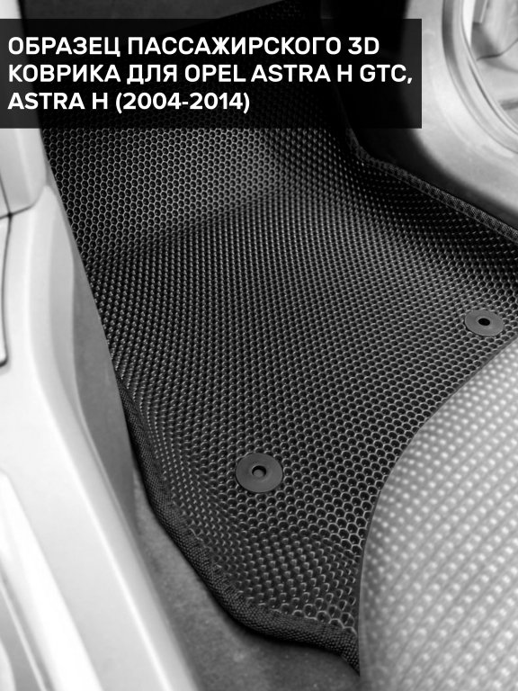 Автомобильные 3д коврики для Opel Astra H GTC (2004-2014) в салон авто и багажник сделаны из инновационного полимерного материала EVA, изысканная структура в виде ячеек не дает воде, пыли и снегу разлетаться по салону машины и багажнику. 3д коврики зафиксированы на полу определенными клипсами, соответствующими Opel Astra H GTC (2004-2014), и не двигаются в процессе езды.