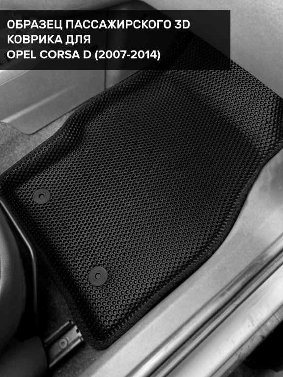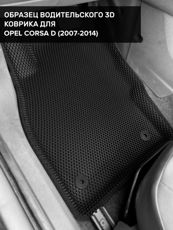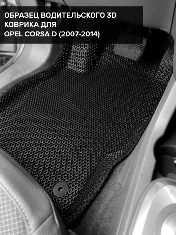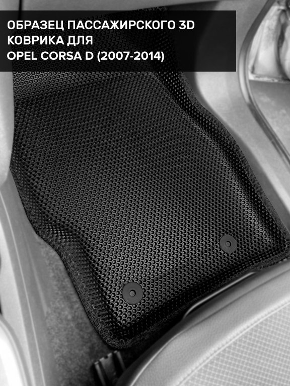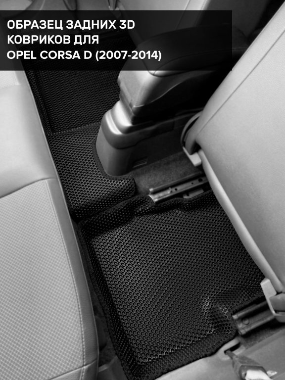 Автомобильные 3д коврики для Opel Corsa D (2006-2014) в салон авто и багажник сделаны из инновационного полимерного материала EVA, изысканная структура в виде ячеек не дает воде, пыли и снегу разлетаться по салону машины и багажнику. 3д коврики зафиксированы на полу определенными клипсами, соответствующими Opel Corsa D (2006-2014), и не двигаются в процессе езды.