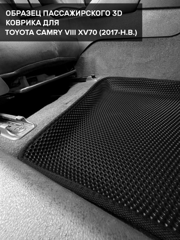 Автомобильные 3д коврики для Toyota Camry VIII XV70 (2017-н.в.) в салон авто и багажник сделаны из инновационного полимерного материала EVA, изысканная структура в виде ячеек не дает воде, пыли и снегу разлетаться по салону машины и багажнику. 3д коврики зафиксированы на полу определенными клипсами, соответствующими Toyota Camry VIII XV70 (2017-н.в.), и не двигаются в процессе езды.
