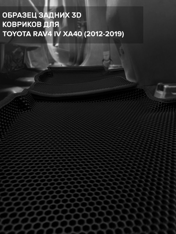 Автомобильные 3д коврики для Toyota RAV4 IV XA40 (2012-2019) в салон авто и багажник сделаны из инновационного полимерного материала EVA, изысканная структура в виде ячеек не дает воде, пыли и снегу разлетаться по салону машины и багажнику. 3д коврики зафиксированы на полу определенными клипсами, соответствующими Toyota RAV4 IV XA40 (2012-2019), и не двигаются в процессе езды.